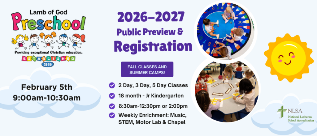 Lamb of God Preschool is accredited by the National Lutheran School Accreditation. For more information, please visit their website at luthed.org/nlsa.