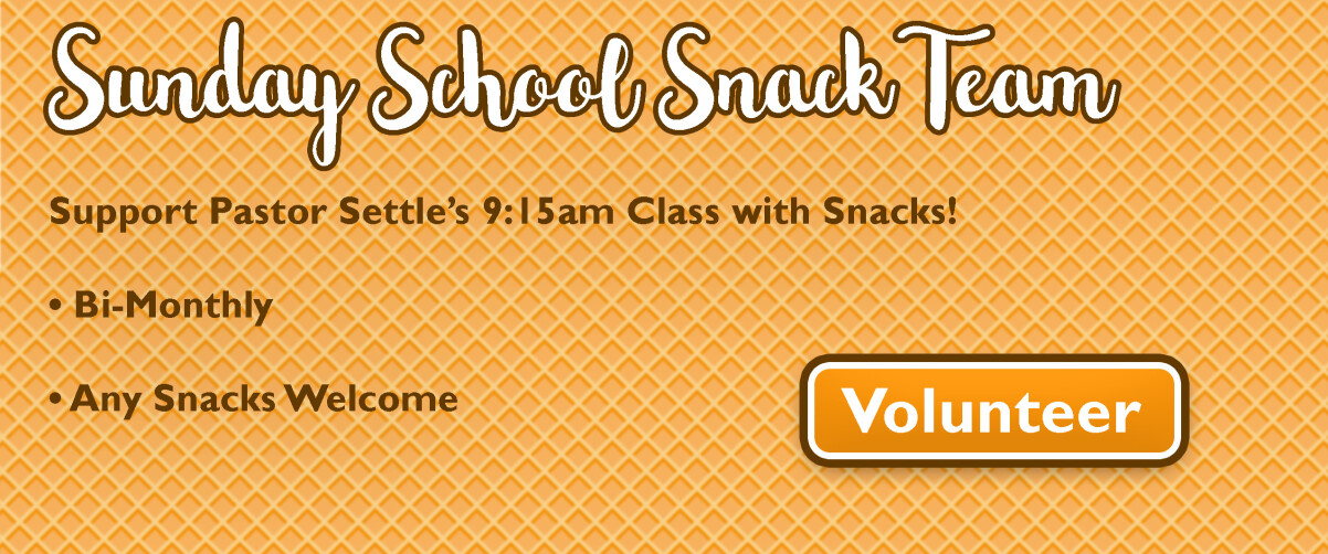 Help us provide snacks for Pastor Settle's 9:15am Bible Study classes on Sundays! We're looking for volunteers to bring snacks every other month this year. You can sign up for even months or odd months, and choose which Sundays out of the months you want to bring snacks. For more details, visit the Sign-Up link below
